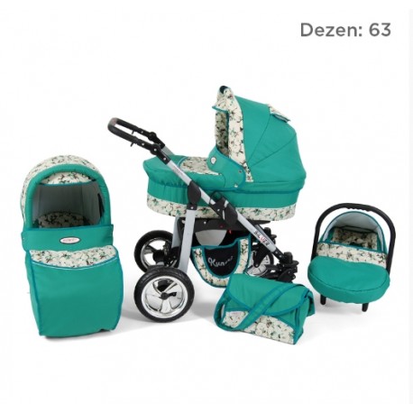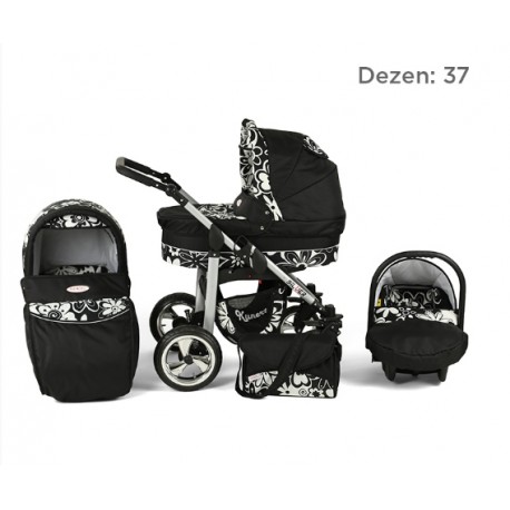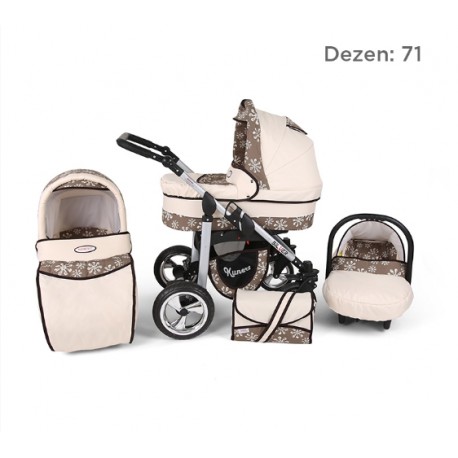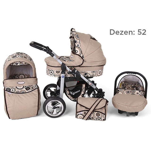 Kolica kunert mila su dostupna u 23 dezena. Aluminijumski ram sa amortizerima i točkovima punjenim gumom, bebi kolijevka, sportski dio, dječije auto sjedište.